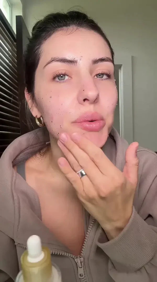 - Appliquez une petite quantité sur peau sèche et massez délicatement en mouvements circulaires pendant 1-2 minutes (vous verrez les peluches = peaux mortes qui partent !)